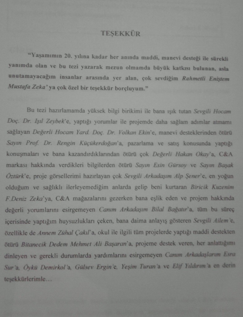 Bu tezi hazırlamamda yüksek bilgi birikimi ile bana ışık tutan Sevgili Hocam Doç. Dr. Işıl Zeybek’e, yaptığı yorumlar ile projemde daha sağlam adımlar atmamı sağlayan Değerli Hocam Yard. Doç. Dr. Volkan Ekin’e, manevi desteklerinden ötürü Sayın Prof. Dr. Rengin Küçükerdoğan’a, pazarlama ve satış konusunda yaptığı konuşmaları ve bana kazandırdıklarından ötürü çok Değerli Hakan Okay’a, C&A markası hakkında verdikleri bilgilerden ötürü Sayın Esin Gürsoy ve Sayın Başak Öztürk’e, proje görsellerimi hazırlayan çok Sevgili Arkadaşım Alp Şener’e, en yoğun olduğum ve sağlıklı ilerleyemediğim anlarda gelip beni kurtaran Biricik Kuzenim F.Deniz Zeka’ya, C&A mağazalarını gezerken bana eşlik eden ve projem hakkında değerli yorumlarını esirgemeyen Canım Arkadaşım Bilal Bağatır’a, tüm bu süreç içerisinde yaptığım huysuzlukları çeken, bana daima anlayış gösteren Sevgili Ailem’e, özellikle de Annem Zühal Çakıl’a, okul ile ilgili tüm projelerde yaptığı maddi destekten ötürü Bitanecik Dedem Mehmet Ali Başaran’a, projeme destek veren, her anlattığımı dinleyen ve gerekli durumlarda yardımlarını esirgemeyen Canım Arkadaşlarım Esra Sur’a, Öykü Demirkol’a, Gülsev Ergin’e, Yeşim Turan’a ve Elif Yıldırım’a en derin teşekkürlerimle…