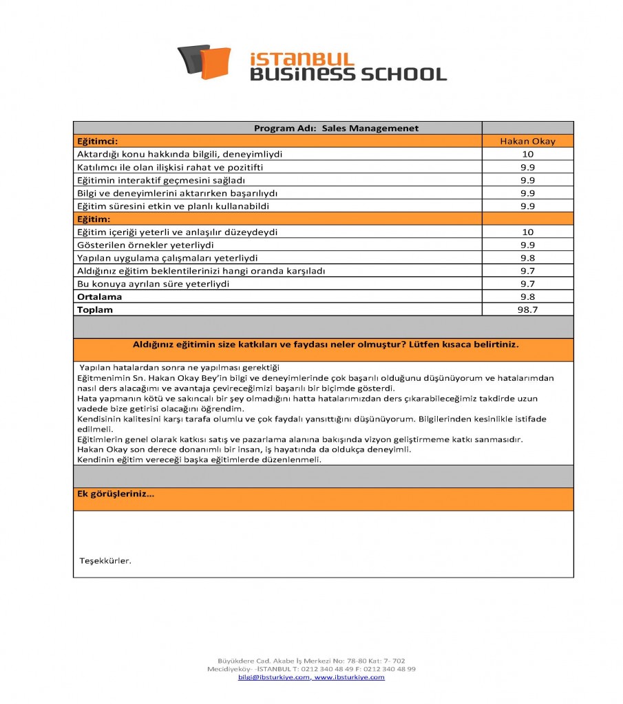 08 Haziran 2011 – IBS Satış Eğitimi katılımcılarının “Feedback formu”
